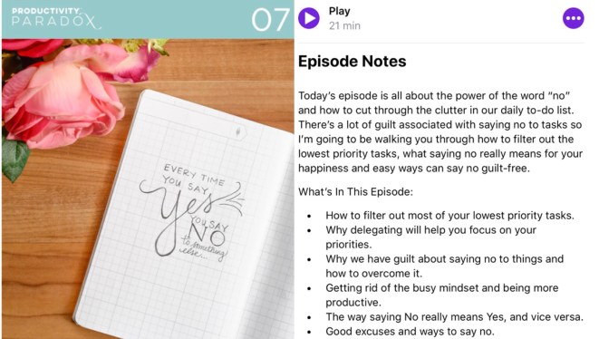 The host, Tonya, also offers advice on how to decide what to eliminate, how to better delegate tasks, and offers many ideas for graceful excuses to have on hand! If your schedule is too jam-packed to listen to it, then you are exactly the intended audience!